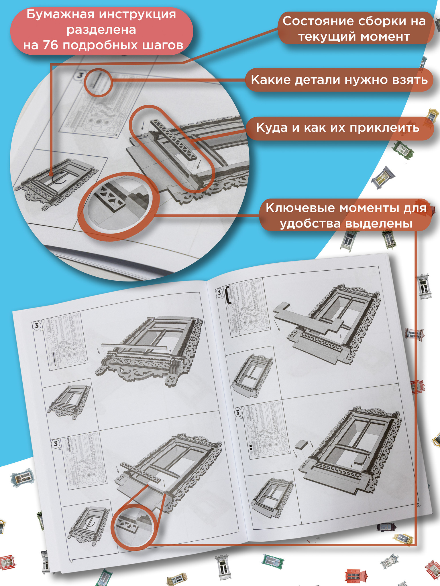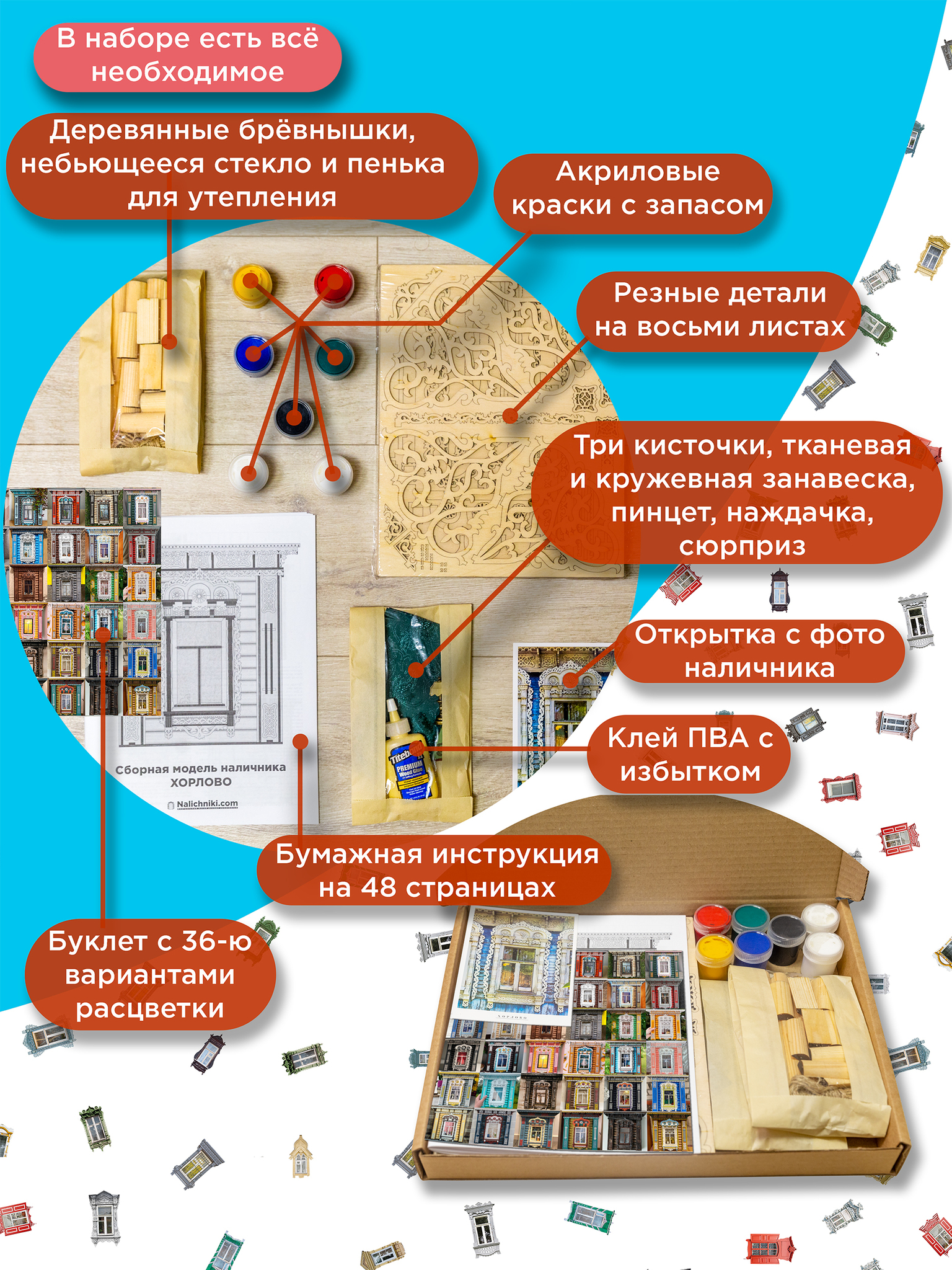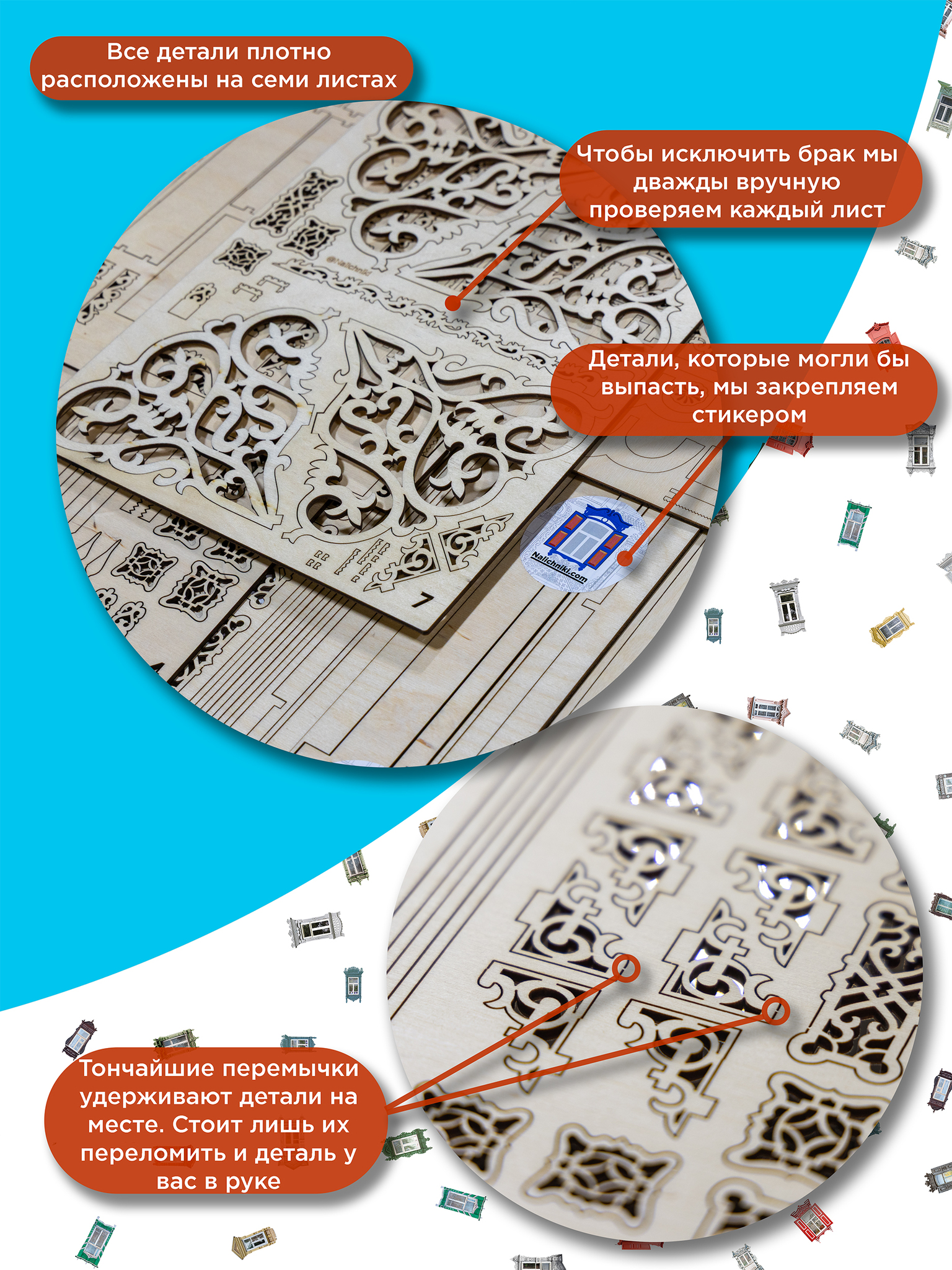 Готовый к сборке набор: макет одного из наличников села Хорлóво Московской области, вырезанный из фанеры.