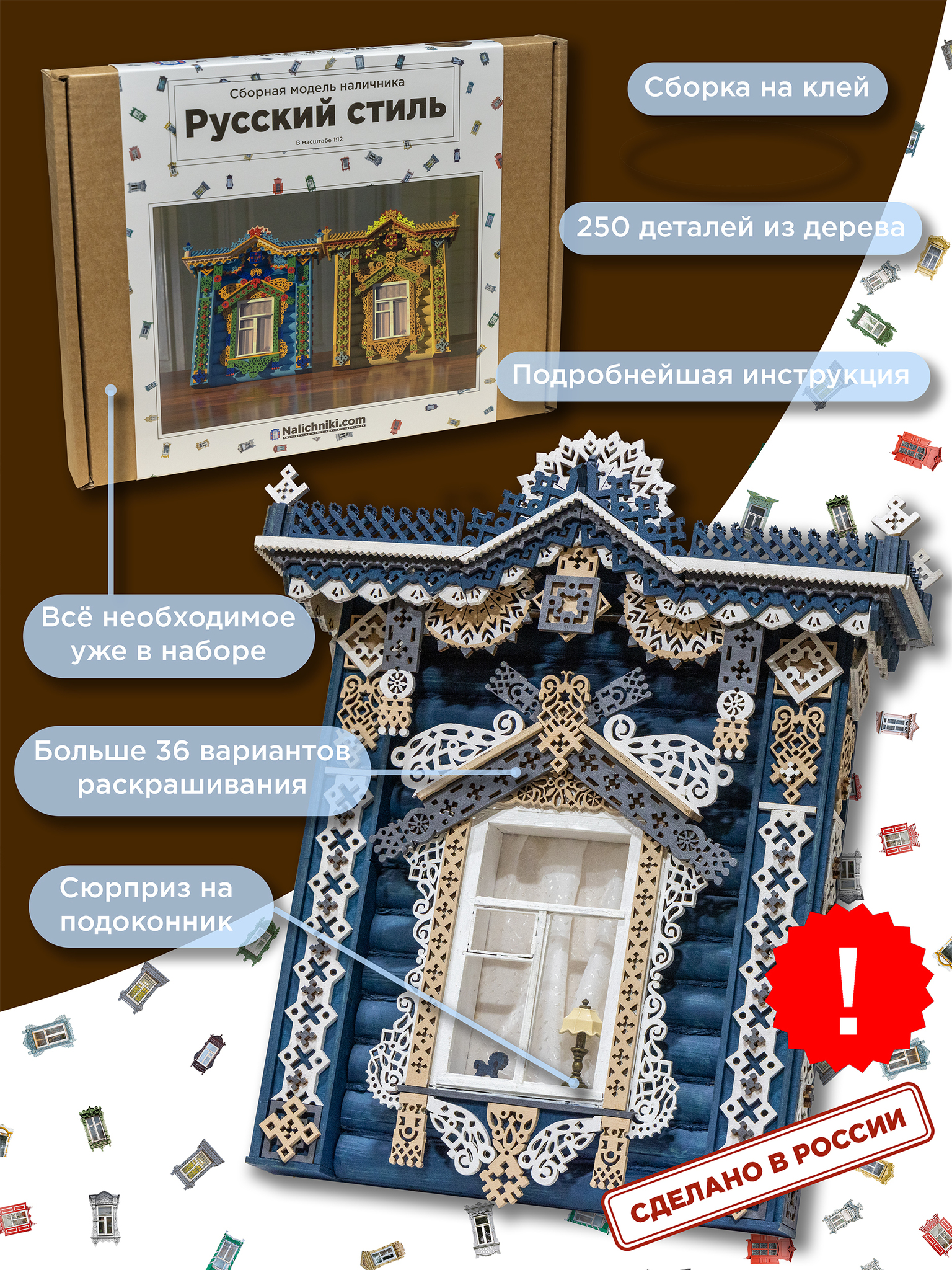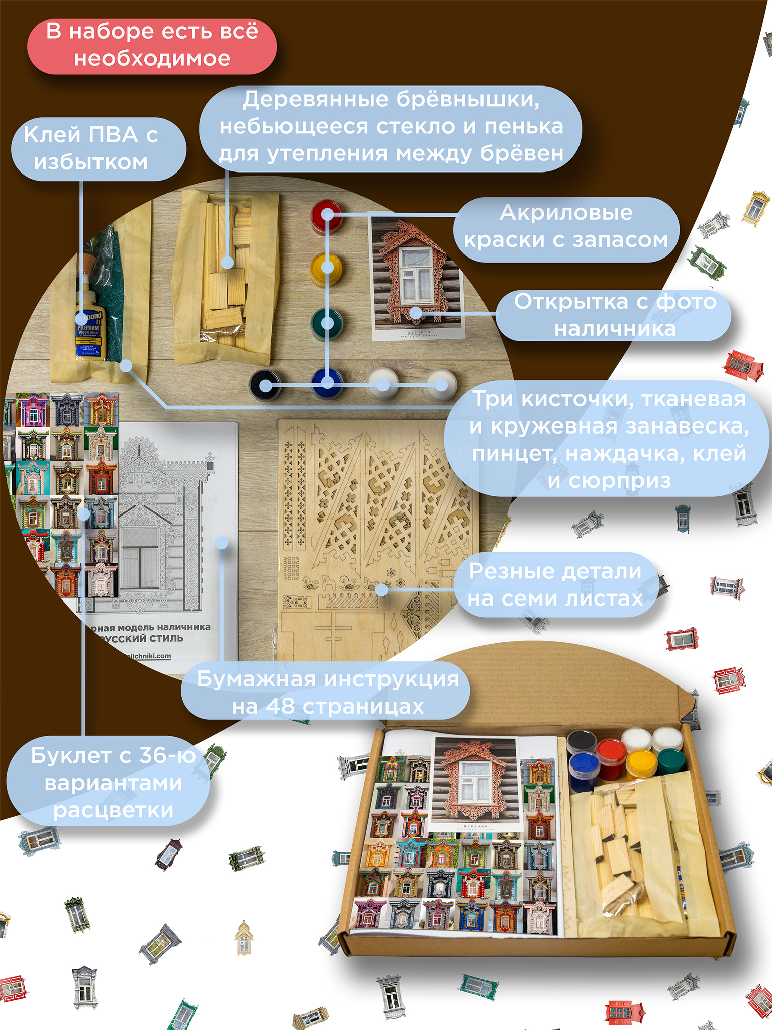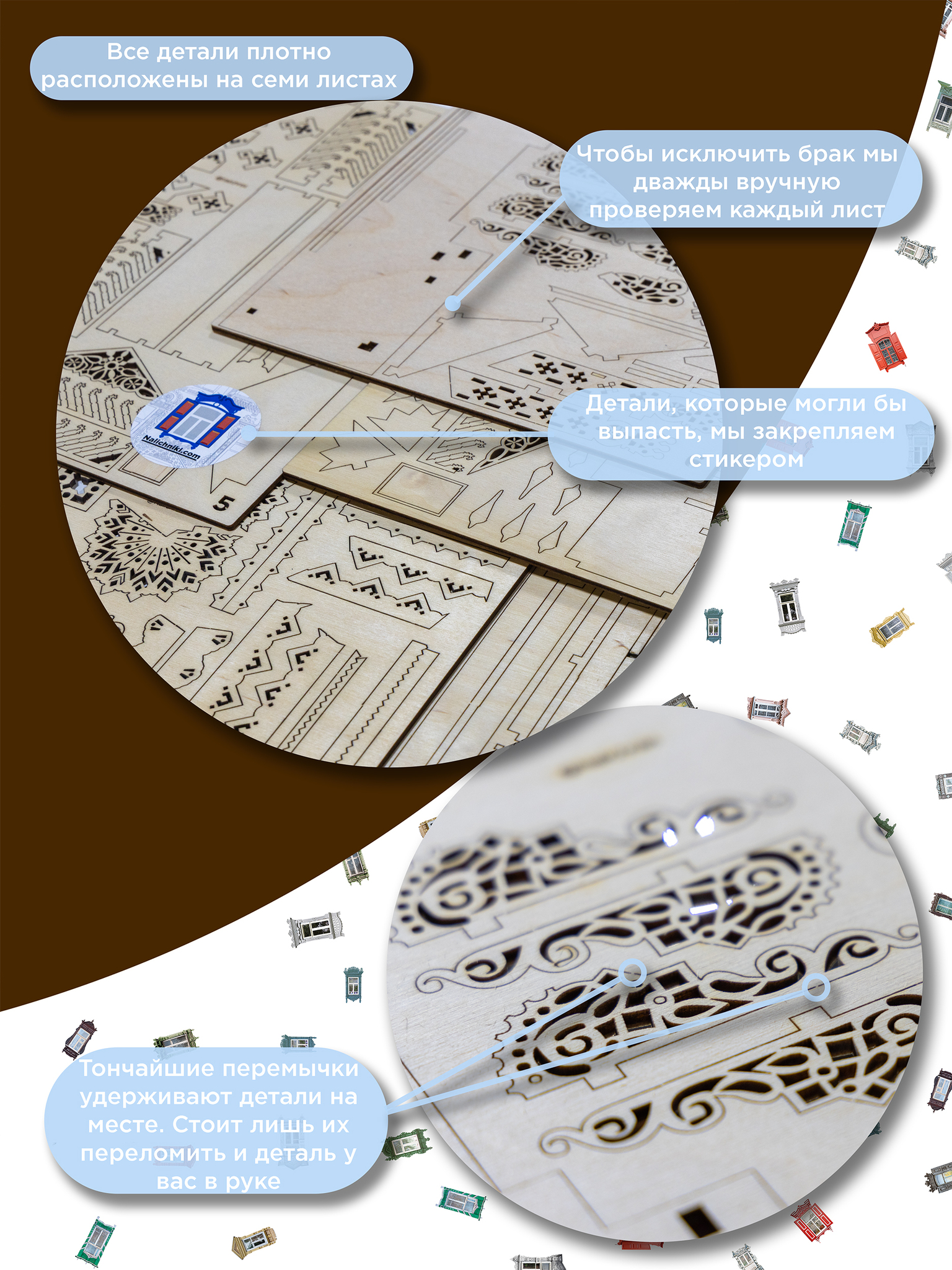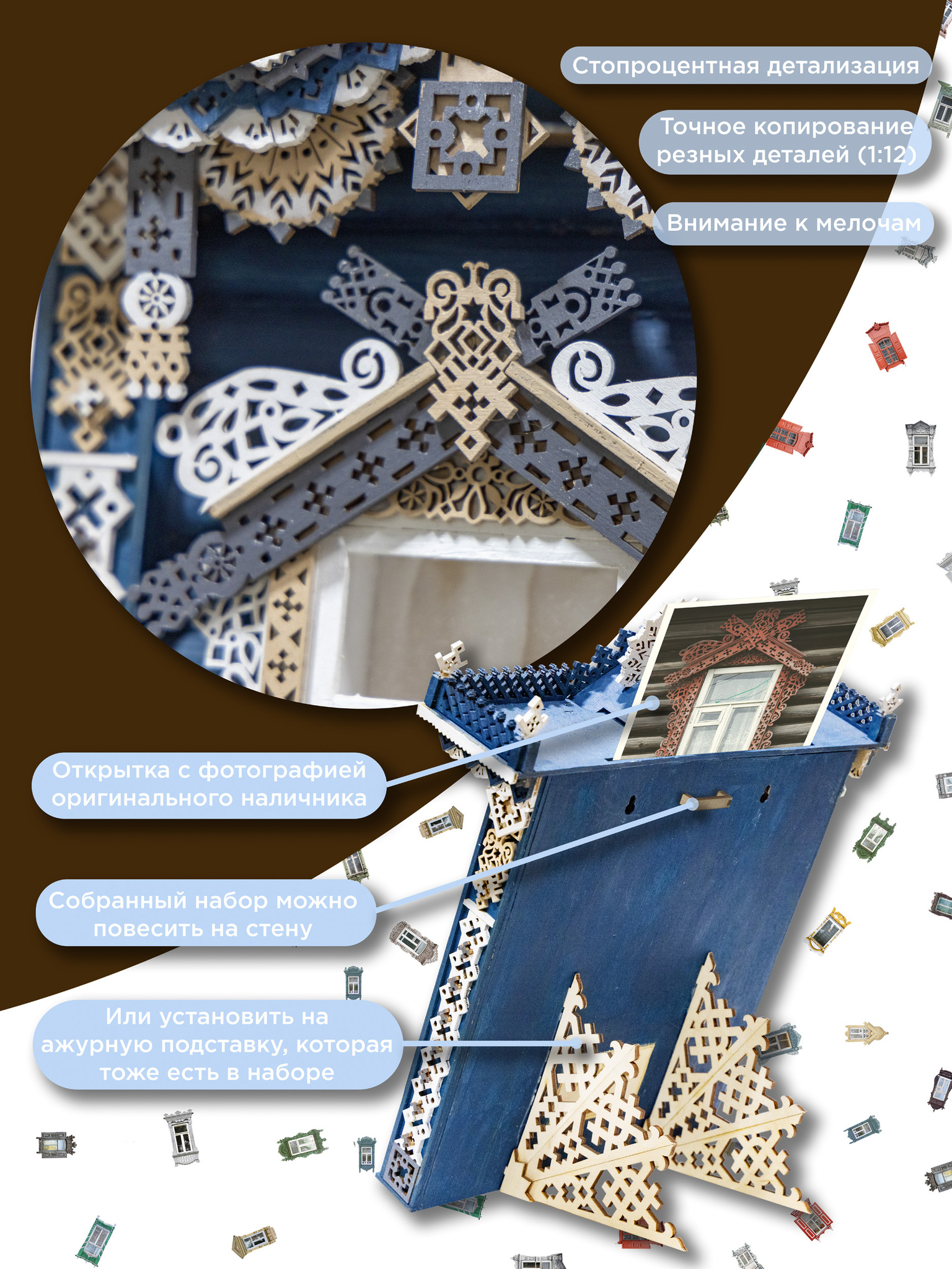 Готовый к сборке набор: макет одного из наличников из города Павлово Нижегородской области, вырезанный из фанеры.